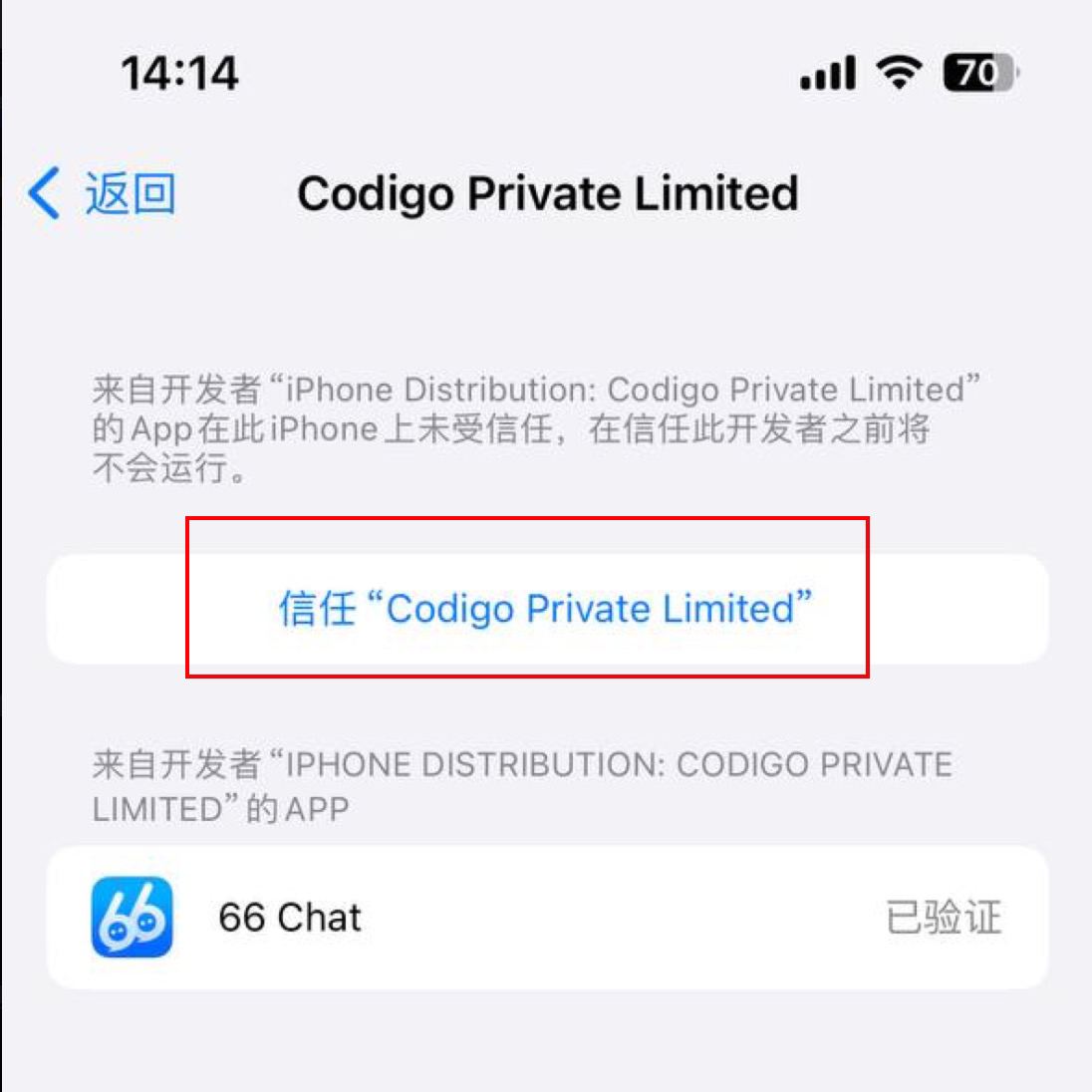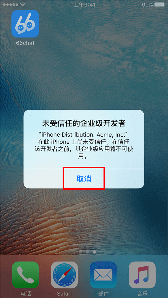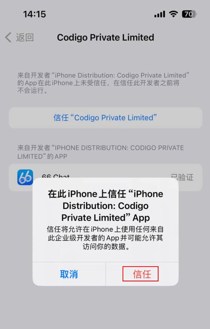 4、根據彈框提示信息,點擊”信任”。返回手機桌面,即可以正常訪問66 App。